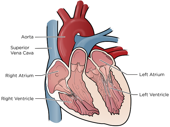 There are many different types of cardiomyopathy. A type of cardiomyopathy that can happen after some chemotherapy treatments is dilated cardiomyopathy. Dilated cardiomyopathy happens when the left ventricle (chamber) of the heart becomes enlarged and can’t pump blood as well as it should (see Figure 1). This can lead to heart failure or arrhythmia. Arrhythmia is when the rhythm of your heartbeat isn’t regular. It can be too fast or too slow.