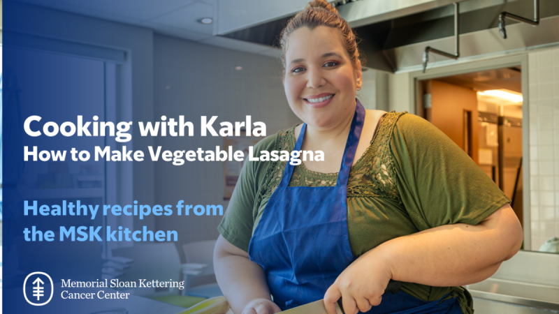 This recipe uses vegetables like eggplant, squash, and mushrooms instead of meat. You will also learn tips to make this lasagna in less time. This video is part of our Cooking with Karla series. Karla Giboyeaux is an registered dietitian nutritionist at the MSK Ralph Lauren Center. She helps people with cancer eat well before, during, and after cancer treatment.