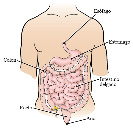 Cuando la comida sale del estómago, pasa al intestino delgado. Las primeras partes del intestino delgado son el duodeno y el yeyuno. En el intestino delgado se siguen digiriendo y absorbiendo los alimentos.