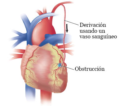 La cirugía de derivación coronaria consiste en ayudar a la sangre a eludir (evitar) una obstrucción. Durante la cirugía, su proveedor de cuidados de la salud unirá un vaso sanguíneo de otra parte del cuerpo a la arteria coronaria. En general, se trata de un vaso sanguíneo del brazo o la pierna. La colocarán por encima y por debajo de la obstrucción para que la sangre pueda rodearla (véase la figura 5).