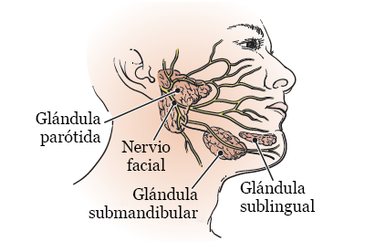 Las glándulas salivales producen saliva, que ayuda al cuerpo a digerir los alimentos y mantiene la boca húmeda. La mayor parte de la saliva proviene de las glándulas parótidas, submandibulares y sublinguales (véase la figura 1). También hay cientos de glándulas salivales más pequeñas en la boca. Están ubicadas debajo de las membranas que recubren la boca y la garganta.