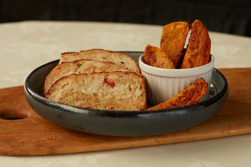 Turkey meatloaf is a great choice if you’re looking to keep calories in check and your heart healthy. Shown here with a side of ginger sweet potato slices.