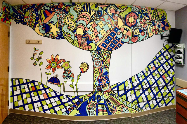 When I returned home after four months in the hospital, I began the process of redefining myself and my new normal. Doodling became a big part of that. I began to share my story and my art in workshops with the purpose of showing people that no matter what you face, big or small, if you take it apart, you can do it. These days, I create murals using my doodling technique, in hospitals and in other spaces where it can help to improve the patient experience. I also donate my custom creations to charities that support people’s well-being when they are facing a catastrophic illness.