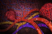 Metastatic tumor in the lung, with different colors used to represent the cell nuclei, the blood vessels, and the P-selectin protein.