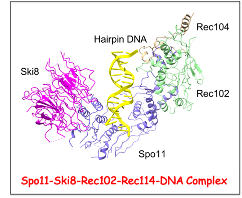 Saccharomyces cerevisiae Spo11-Rec102-Rec104-Ski8 core complex bound to DNA, thereby defining the positioning of the overhang-containing DNA into the Spo11 subunit reflecting formation of the product state following staggered DNA cleavage. Future challenges include structure-function studies of additional states of the DNA-bound core complex, as well as structural elucidation of intermolecular contact patterns stabilizing components of the Rec114-Mei4-Mer2 complex towards a molecular understanding of DSB formation and repair during meiosis.