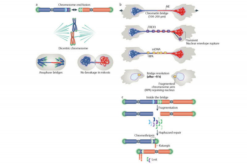 Telomere crisis threatens genome stability through the formation of dicentric chromosomes. Dicentric chromosomes, or chromosomes with two centromeres, can be destabilized during mitosis by making attachments to opposite spindle poles. Preliminary observations of apparent dicentric chromosome breakage during anaphase initiated the widely held view that dicentrics cannot survive mitosis intact. Given relatively weak mitotic spindle pulling forces (~1nN) and strong chromosome tensile strength (>100 nN), we hypothesized that the mitotic spindle could not break dicentric chromosomes. To test this we have developed a conditional system to mimic telomere crisis and address outstanding questions regarding the resolution of dicentric chromosomes and the genomic legacy of telomere crisis. Using this model, we have shown that dicentrics survive mitosis intact (Figure 2) and develop into chromatin bridges that connect daughter cells into the next cell cycle (Figure 3). These bridges are attacked by the cytoplasmic nuclease, TREX1, which gains access to the DNA during nuclear envelope rupturing events induced by chromatin bridges (Figure 4). Cells that survive telomere crisis display frequent chromothripsis (chromosome shattering) and kataegis (clustered, strand-coordinated mutations), suggesting that the DNA damage that precedes these catastrophic events is compartmentalized to chromatin bridges (Figure 5).