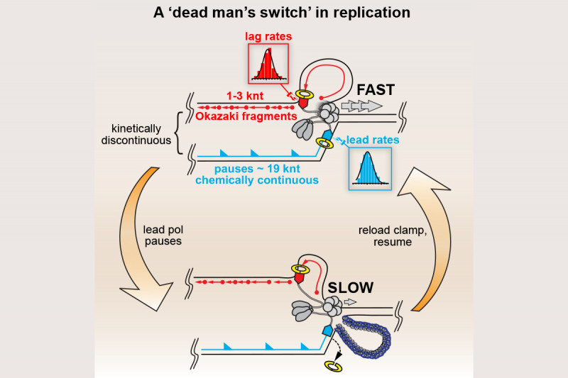 In collaboration with Steve Kowalczykowski’s group we subsequently demonstrated that the so-called polymerase uncoupling event (i.e., where, as described above, the leading-strand polymerase remains stalled while template unwinding and lagging-strand synthesis proceed downstream) that is thought to occur is actually a manifestation of an intrinsic lack of coordination between the leading- and lagging-strand polymerases. The two DNA polymerases at the replication fork do not communicate at all. Their behavior is completely independent and stochastic. They each sample from the same distribution of possible polymerization rates and they each exhibit pausing and switching of polymerization rates. Thus, at any given time the lagging-strand polymerase could be moving faster than the leading-strand polymerase and vice-versa. To prevent the accumulation of unreplicated gaps in the nascent DNA, when the leading-strand polymerase pauses the rate of the DNA helicase unwinding the parental template is reduced to about 15% of the normal rate. Once the leading-strand polymerase resumes DNA synthesis, it catches up to the helicase and rapid template unwinding and replication can continue (Fig. 3). We have termed this fail-safe mechanism a “Dead-man’s Switch.”
