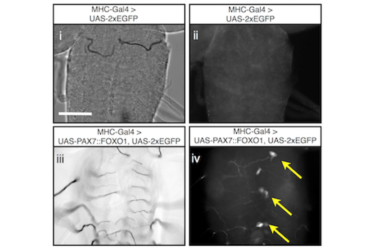 ARMS uniquely associates with chromosomal translocations t(2;13)(q35;q14) and t(1;13)(p36;q14), leading to the production of the fusion oncoproteins PAX3::FOXO1A or PAX7::FOXO1A. Expression of a human PAX7::FOXO1A fusion protein alone in Drosophila mesoderm leads to a population of free larval myoblasts that transform into aggressive cells that leave the muscle compartment, migrate, and invade nonadjacent tissues, including the central nervous system (CNS).
