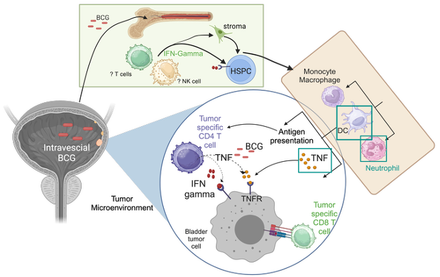 Our most recent data (Daman et al) demonstrate a surpirsing new mechanism for BCG. We demonstrated that BCG acts systemically to reprogram myelopoesis in the bone marrow, thereby enhancing the antitumor effects of teh myeloid tumor microenvironment. Please see this article for additional perspective: