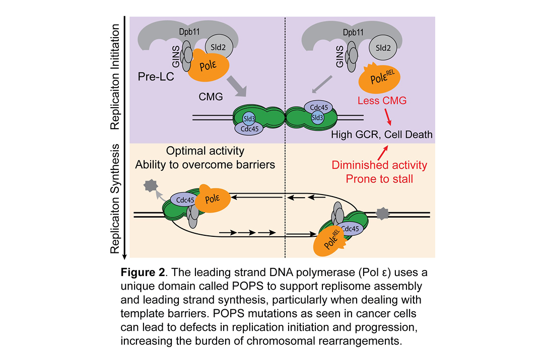 Mechanisms Governing Genome Duplication. Genome duplication is a complex and essential process that requires careful regulation during its three stages, namely replication initiation, progression, and termination. Our lab has made discoveries at each stage of replication. We revealed a novel SUMO-based control of the replicative helicase that prevents premature replication initiation in G1 phase (Wei and Zhao Nat Struct Mol Biol 2016). We identified a key feature that supports the leading strand polymerase in continuous synthesis of long stretches of DNA and linked this feature to cancer-prevention (Meng et al, Nat Commun 2020) (Figure 2). We uncovered a role for the essential Smc5/6 complex in completing replication (Peng et al PLoS Genet 2018). These studies were carried out by GSK and Tri-Institutional MD/PhD students and postdocs and they have opened up new avenues of further inquiries into the mechanisms governing replication and its regulation. For example, current lab members are uncovering additional SUMO-based control of replication initiation, new mechanisms to promote leading strand synthesis, and replisome dynamics from start to finish in the synthesis process.