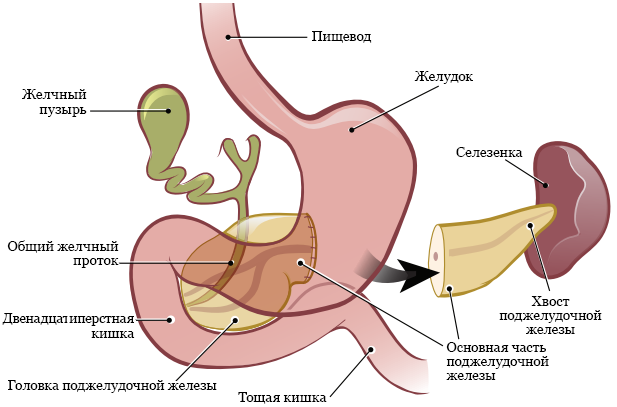 Поджелудочная железа вырабатывает ферменты, которые способствуют перевариванию съеденной пищи, в том числе жиров. Она также вырабатывает инсулин и глюкагон — горомоны, которые помогают регулировать уровень сахара в крови. Поджелудочная железа состоит из 3 частей: хвоста, тела и головки.
