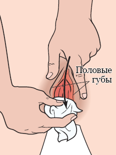 - Очистите область между половыми губами салфеткой с кастильским мылом (см. рисунок 1). Выбросьте салфетку в мусорное ведро.