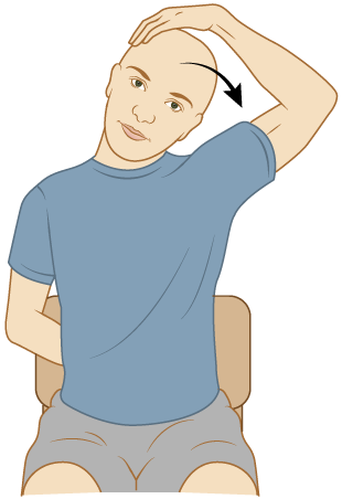- Повторите шаги с 1 по 4 с наклоном в другую сторону. Заведите левую руку за спину, положите правую руку на голову и наклоните голову к правому плечу.