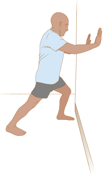 - Встаньте лицом к стене, положив одну или обе руки на стену для опоры. Шагните одной ногой к стене.